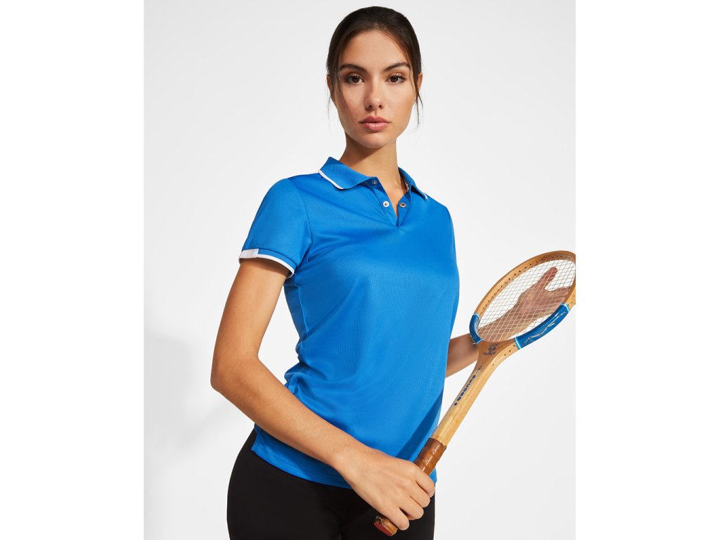 Dámská sportovní polokošile s krátkým rukávem z antibakteriálního recyklovaného polyesteru. Polokošile má 1x1 žebrovaný límec a detail v kontrastní barvě v lemech rukávů a na ramenou. Zesílené kryté švy v límci. Zapínání na dva zapínací knoflíky a skrytý spodní knoflík. Boční rozparky na spodním lemu.Doplňkové parametry