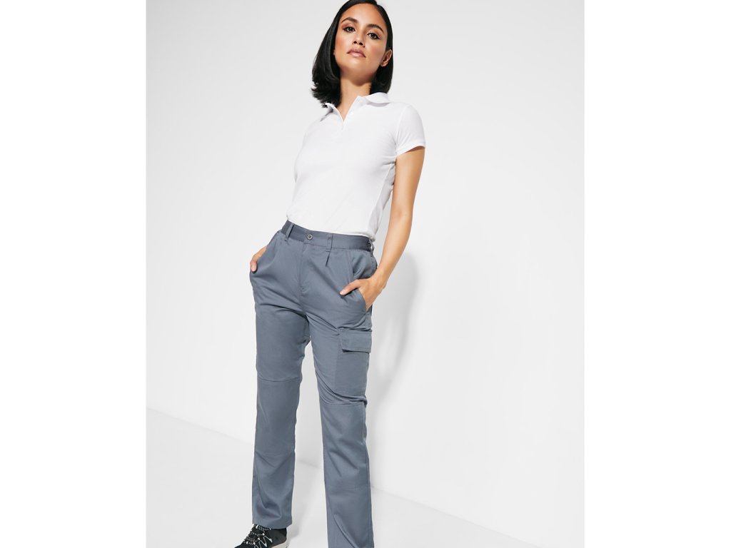 Dámské pracovní kalhoty se dvěma předními kapsami. Upravitelný obvod pasu. Zesílená dvojitá zadní část. Dvě zadní funkční kapsy, jedna postranní. Pas s poutky na opasek.