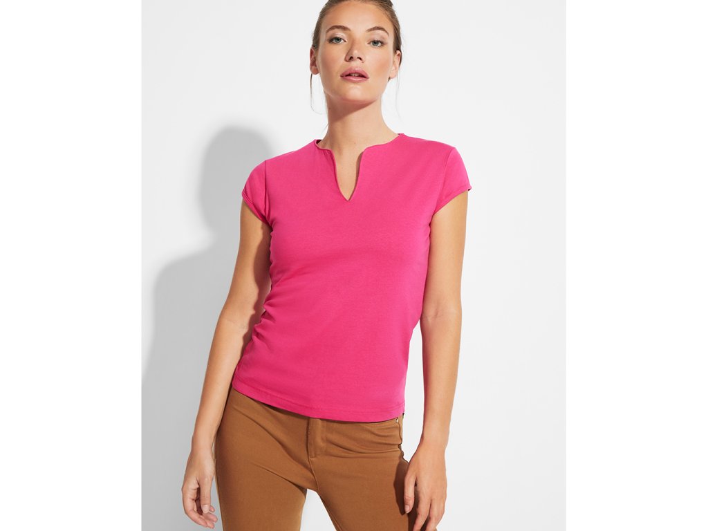 Vypasované dámské tričko s kulatým výstřihem prostřiženým do V. Krátké rukávky, boční švy.