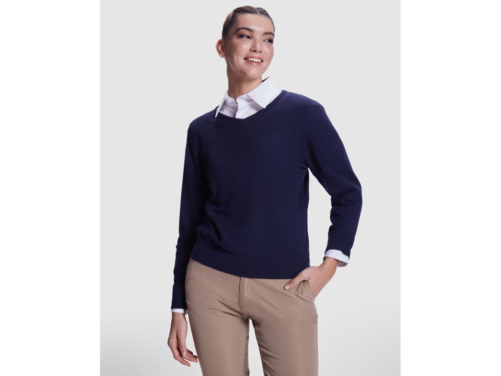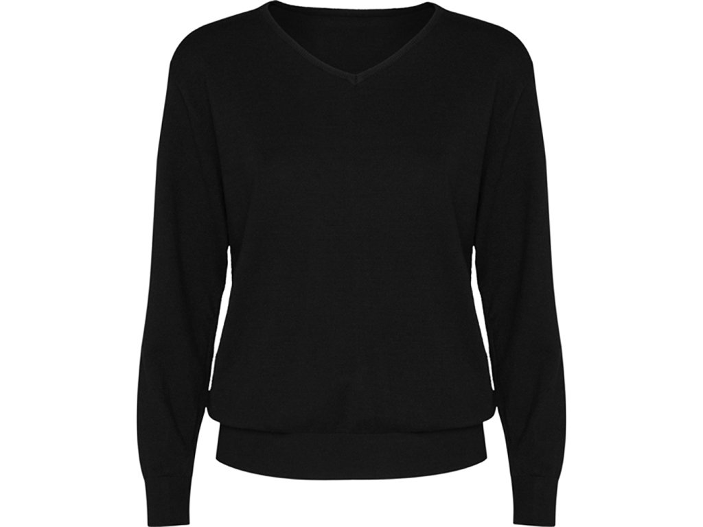 Dámský svetr z jemného úpletu s výstřihem ve tvaru V. Odpovídající žebrování 1x1 u krku, manžet a lemu.Doplňkové parametry