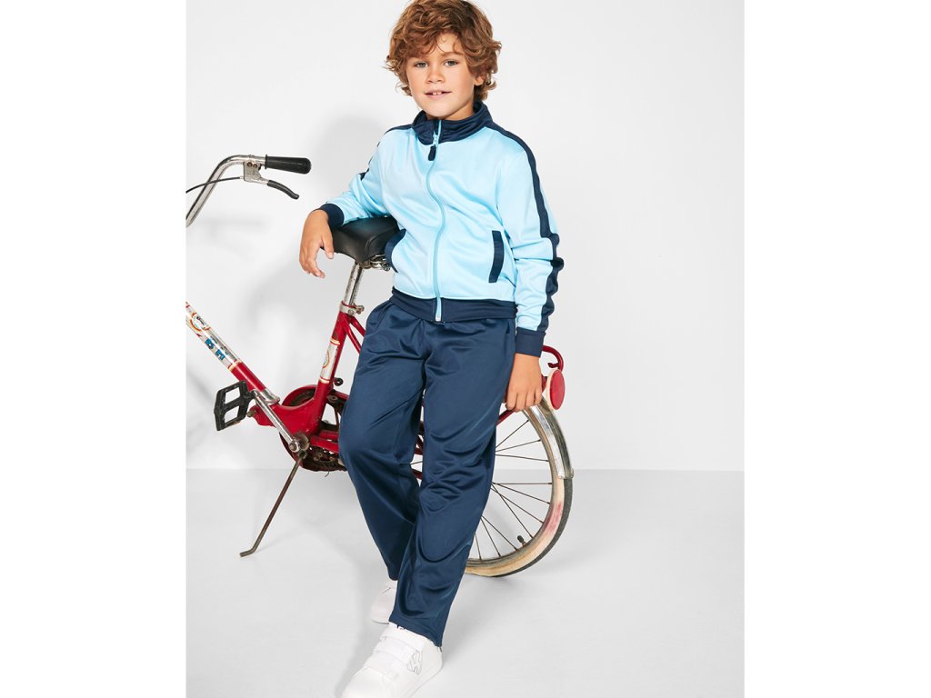 Dětská sportovní souprava, skládající se ze 2 části - tepláky a mikina. Vysoký límec se zapínáním na zip s krytkou na bradu. Přední kapsy s kontrastním lemem. Kontrastní manžety a žebrovaný lem 1x1. Celopropínací zip. Kalhoty s pružným pasem s dvěma bočními kapsami s kontrastním lemem. Velmi příjemná vnitřní strana.
