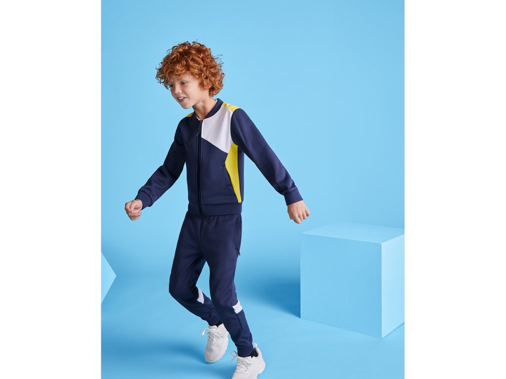 Sportovní bunda s předním zapínáním na zip. Boční kapsy se zapínáním na zip. Límec, manžety a spodní lem s 1x1 žebrováním. Asymetrický hlavní prvek na levé straně hrudníku, speciálně navržený pro vyšívání. Lze kombinovat s kalhotami Rodas.