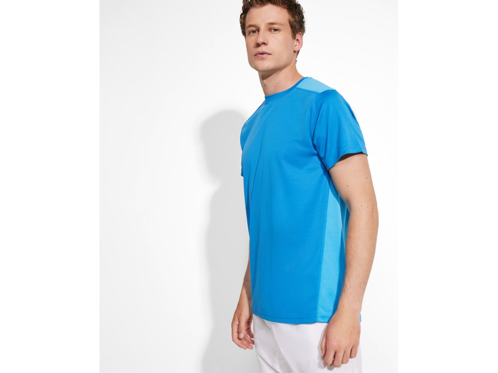 Funkční triko s krátkým rukávem.Tričko má kulatý výstřih a je kombinací dvou polyesterových tkanin.Přední materiál polyester honeycomb a polyester 3D mřížky na ramenou a zadní straně .Materiál dobře absorbuje vlhkost a má dekorativní švy na ramenou,na bocích a prodlouženou zadní stranu.Doplňkové parametry