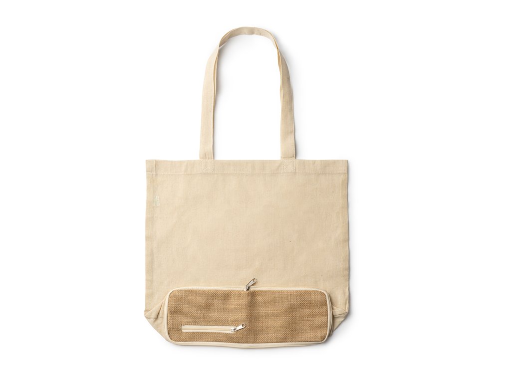 Skládací taška ze 100% bavlny (110 g/m²) se dnem z juty. Součástí je vnější kapsa. Zesílená ucha o délce 60 cm. Snadné skládání a zapínání na zip.Doplňkové parametry