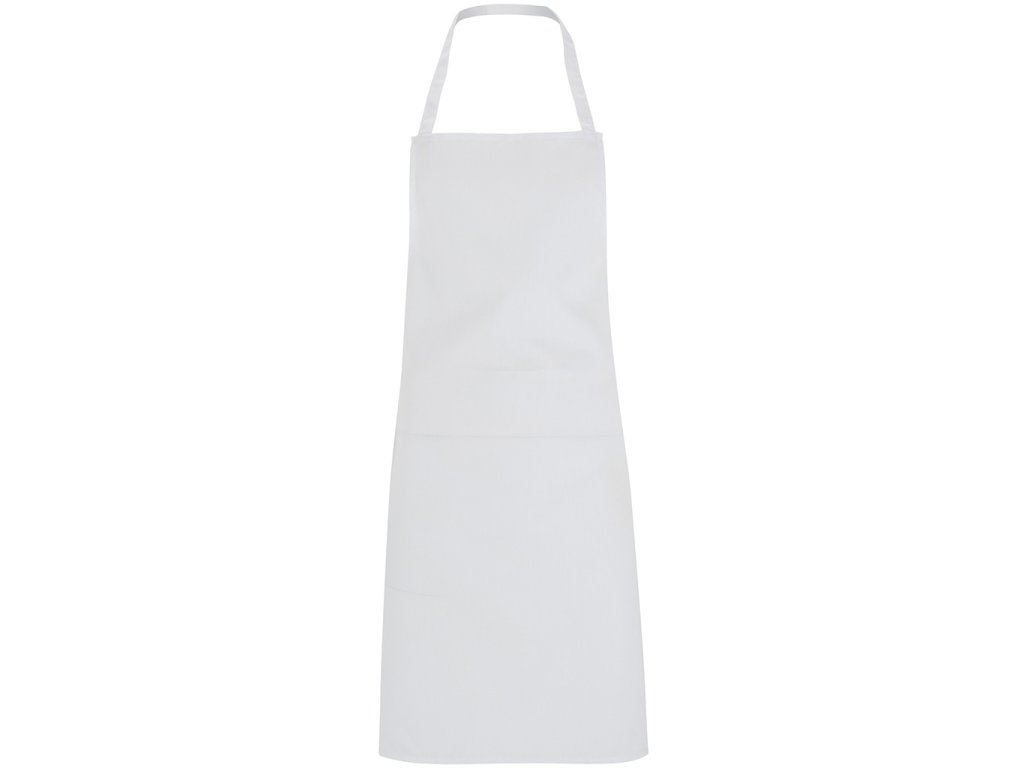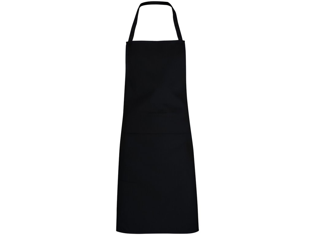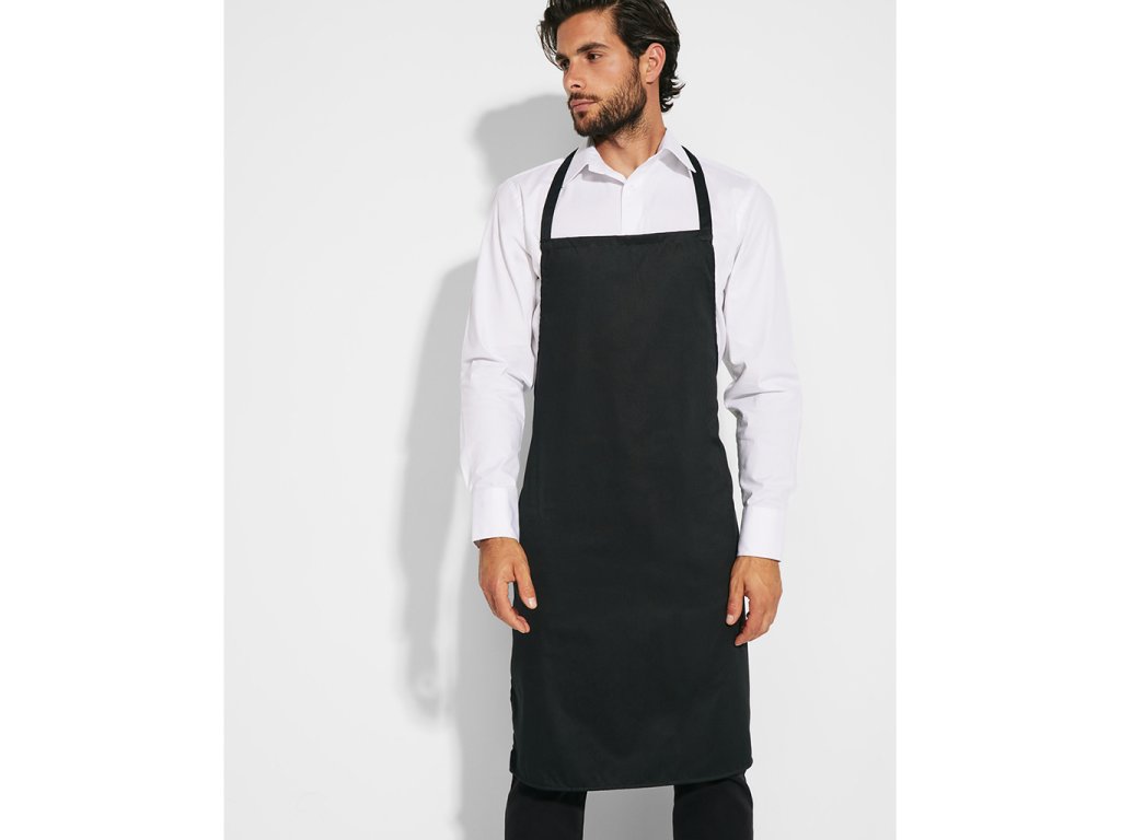 Dlouhá zástěra bez kapes, s páskem za krk a postranními šňůrkámi na uvázání ve stejné barvě. Model je vhodný pro přípravu potravin. Odnímatelný štítek.